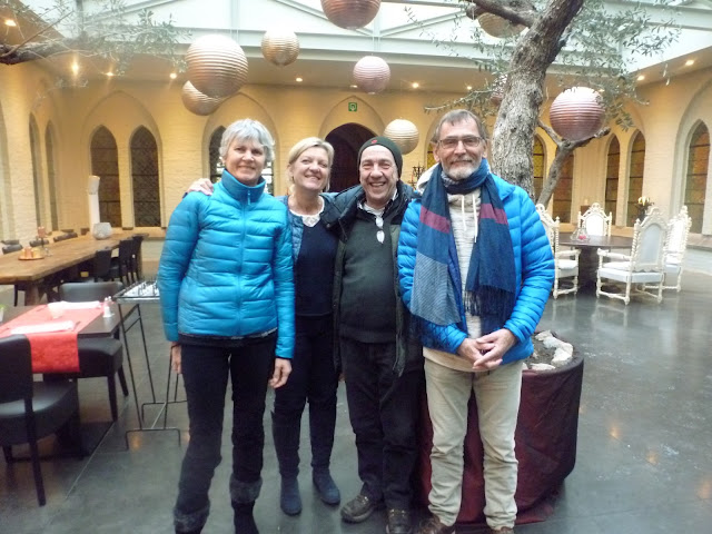 Daar zouden we Christophe en Marie-Claire uit Luxemburg aantreffen. Eveneens een pelgrimskoppel dat ik samen met Fabienne heb ontmoet in Roncesvalles. Tot in Pamplona zijn we samengebleven op de Camino. Ook hier weer een hartelijk weerzien. En ook hier weer net of we elkaar nog maar onlangs ontmoet hadden. Ook zij zijn verwoede stappers. Christophe heeft nog niet zo lang geleden de Californian West Coast Trail gelopen. Een slordige 2000 km langs de westkust van de VS. Na een lekker dineetje in het 'Maison de Leffe' aangeboden door Christophe zijn we de OLV kerk van Dinant gaan bezoeken gevolgd door een stadswandelingetje. De wegen en straten waren spekglad door de ijsregen. Het verwonderde me dat ze er met de wagen vanuit Luxemburg doorgekomen waren. In een toeristenwinkeltje werd Dinantse koek aangeschaft om bij een pintje te degusteren. Niet te vreten zulke koeken. Je kan evengoed je tanden in een baksteen zetten. Ook nu weer oeverloos bijpraten, verwondering en blijdschap om de verre vriendschap opnieuw wat in te kleuren. Een onverbreekbare band tussen ex-pelgrims werd nog eens hersmeed. Onze vriendin Fabienne is dan 's avonds met hen meegereisd naar Luxemburg waar ze zondag Luxemburgstad zou gaan bezoeken. Maandag zou ze terug naar Antwerpen komen. De logies bij Christophe en Marie-Claire waren haar geweldig goed bevallen. Maandag, bij haar terugkeer, werd het dus een bezoekje aan mijn koekestad. Alhoewel onze vriendin redelijk bereisd is en was, had ze zich onze steden heel anders voorgesteld. Fransmannen hebben, en dat is alom gekend, toch wel kleine chauvinistische trekjes. Ze was enigszins verrast dat er zich ten noorden van hun Douce France er nog grootsteden bevinden. Dinsdag Brussel en weer enigszins die verbijstering. Het Koninklijk Paleis, de Grote Markt, de Warande, de St.Michiel en St. Goedelekathedraal waar onze koningen huwden, de Munt, het Stadhuis, de Kunstberg, het justitiepaleis van 'de skieve architect Poelaert', de vlooienmarkt .... Brussel in een notedoppeke. Ik zou Manneke en Jeanneke Pis nog bijna vergeten hebben. Aan de Hallepoort staat er een menhir opgesteld. Deze en een bijhorende marmeren gedenkplaaat trok haar aandacht want deze was geschonken door de Galicische Xunta als eerbetoon aan de anonieme pelgrim. Een beetje toeval (als het al bestaat) kaderend in ons pelgrimstreffen is nooit ver weg : Aan het monument kregen we het bezoek van een voorbijganger. Een katholieke Syriër zichzelf voorstellend als Buthros (Petrus) had zelf ook een pelgrimsverleden en had ooit van Oms naar Damascus gepelgrimeerd. Hij had geen flauw benul wat die menhir voorstelde en toch werd hij erdoor aangetrokken. Bijna dagelijks liep hij er een ommetje langs maar hij wist in de verste verte niet waarom. Na onze uitleg was hij erg verbaasd en geëmotioneerd bedankte hij ons voor de uitleg. Onze 'explicatie' had hem, het droevige verhaal in zijn thuisland indachtig, blijkbaar een beetje opgemonterd.